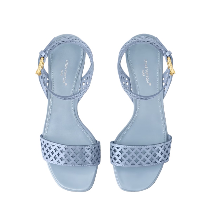 The Silhouette sandal is crafted from patent calf leather with intricate Monogram Flower perforations. This sophisticated style comes on a high heel in the shape of a Monogram Flower, a key signature of the Silhouette line. It fastens around the ankle with an engraved, gold-toned buckle.