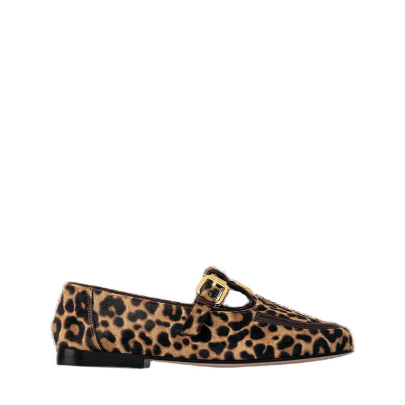The Soho Mary Jane flat loafer comes in hairy calf leather with an eye-catching leopard print. This style is complemented by refined details, including leather trim on the vamp and an LV Circle accessory on the T-bar. The strap is adjusted with a square buckle in gold-toned metal.