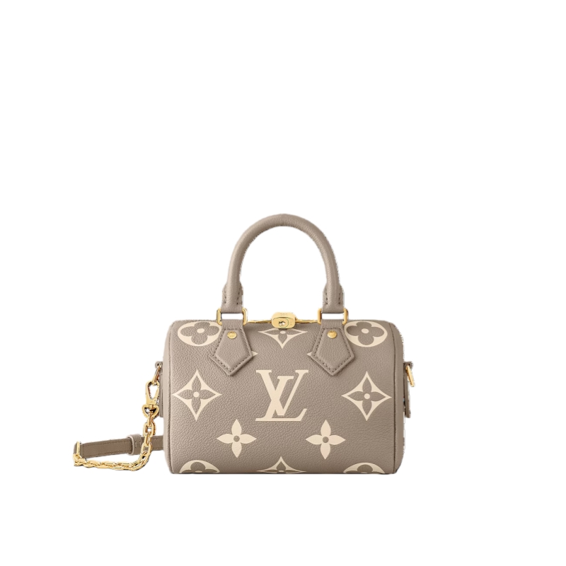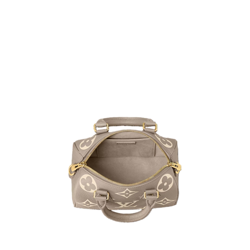 Made from two-tone Monogram Empreinte leather with the LVs and Monogram Flowers in a cream color, the Speedy Bandoulière 20 handbag is a modern classic. Inspired by the House’s Speedy luggage line introduced in the 1930s, it features the same shape and articulated top handles. A chain-and-leather strap enable shoulder and cross-body wear.