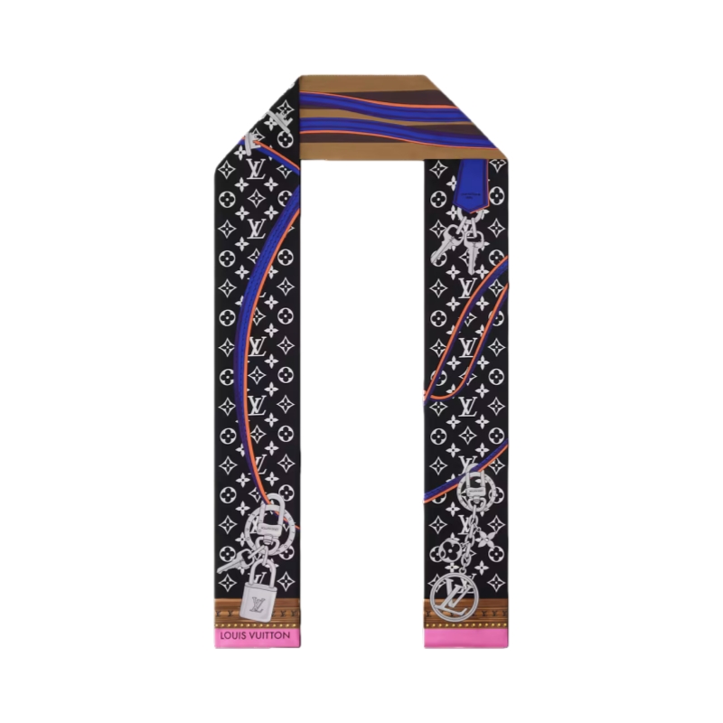 The bold design of the Strap And Trunk bandeau was inspired by the look of historic Monogram luggage from the 19th century. Printed on pure silk, it features a trunk-style leather strap plus a chain adorned with emblematic Louis Vuitton charms. An elegant, eye-catching accessory, and a tribute to the House’s heritage in the art of travel.