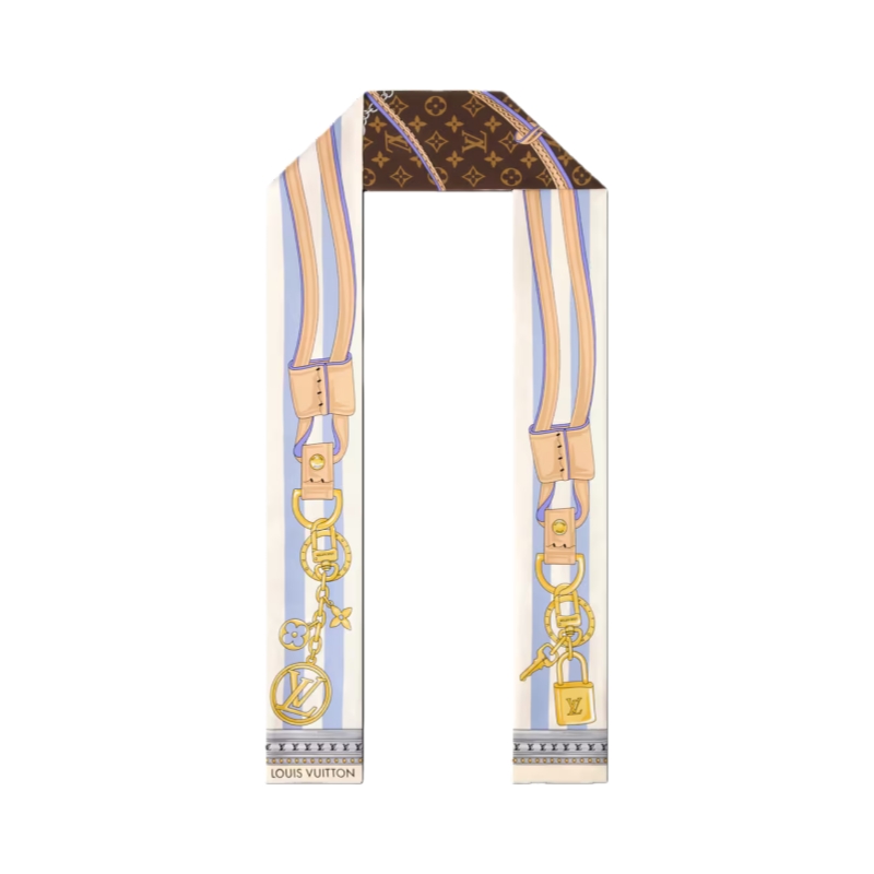 The bold design of the Strap And Trunk bandeau was inspired by the look of historic Monogram luggage from the 19th century. Printed on pure silk, it features a trunk-style leather strap plus a chain adorned with emblematic Louis Vuitton charms. An elegant, eye-catching accessory, and a tribute to the House’s heritage in the art of travel.