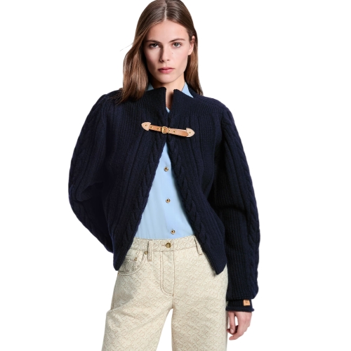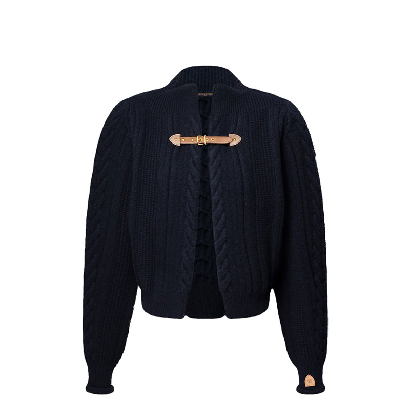 This cozy cardigan is reimagined with sophisticated detailing for a chic, modern look. It is spun from a wool blend with thick cable-knit detailing throughout. The front is fastened with a slim leather buckle strap inspired by equestrian style, while an LV Circle patch adds a subtle signature to the left cuff.