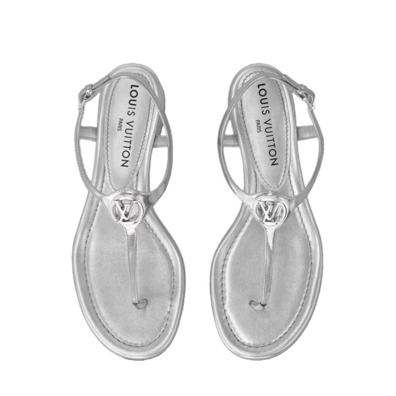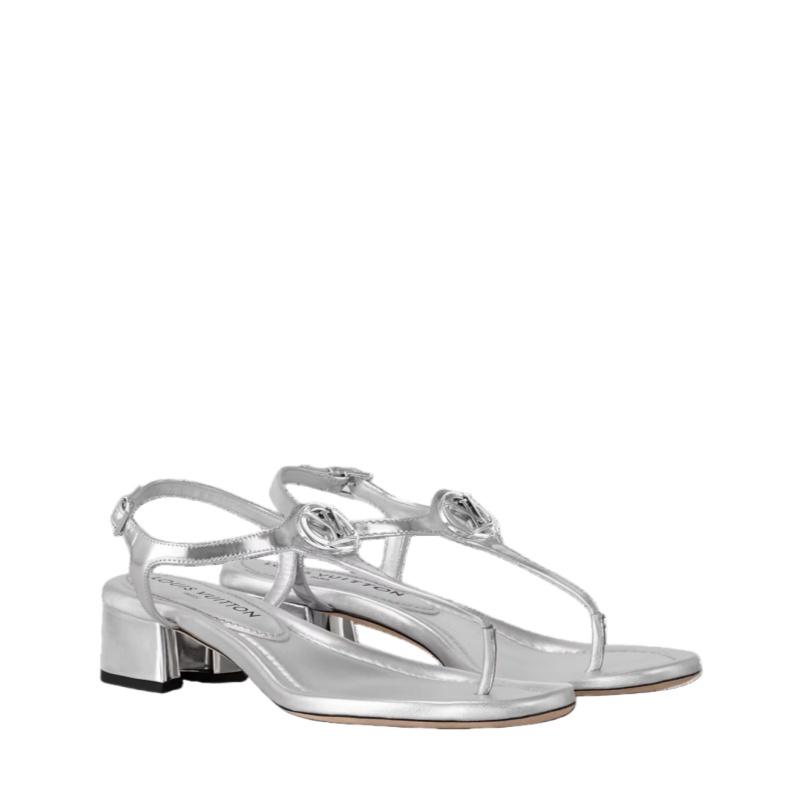 The Sunkiss sandal is a chic yet easy-to-wear model in metallic calf leather. The thong-style upper is signed with a coordinating LV Circle accessory, while the back strap fastens with a small, rectangular buckle. This sandal comes on a low block heel with a distinctive half-flower shape.