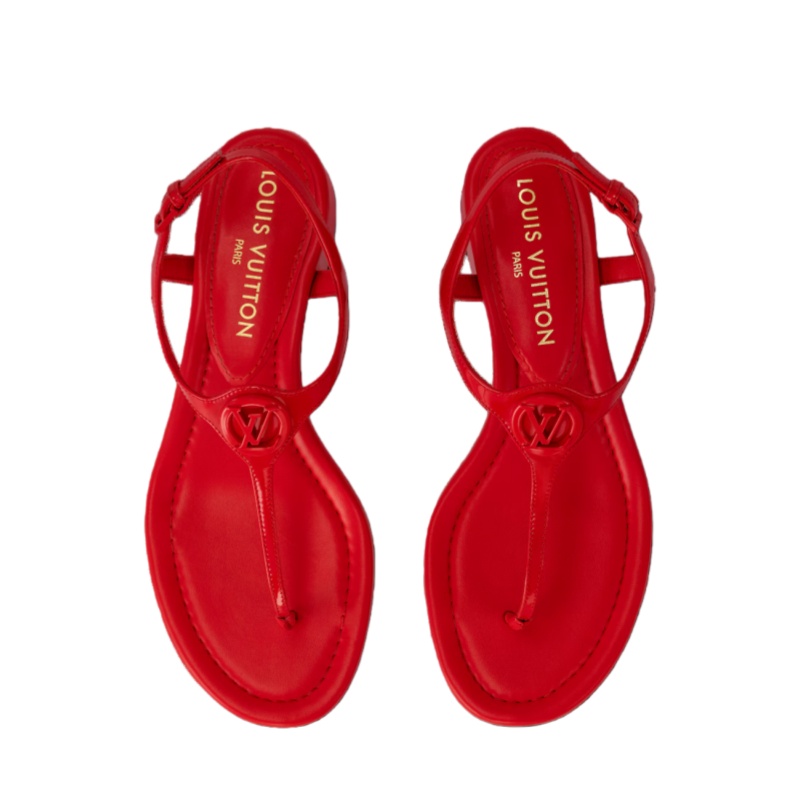 The Sunkiss sandal is a chic, simple design in high-shine patent calf leather. Its minimalist, thong-style upper is complemented by tone-on-tone details: an LV Circle accessory on the front and a rectangular buckle on the back strap. Its low heel, which is covered in patent leather, has a distinctive, V-shaped cut-out highlighted by a metallic interior.