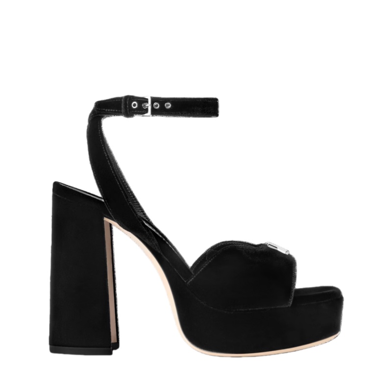 The Swing platform sandal is a sophisticated, evening-ready style in soft velvet. The smooth texture of the velvet contrasts with shiny, silver-toned metal of the LV Initials accessory on the rounded front strap, and the small buckle on the adjustable ankle strap. This model's high, V-shaped block heel features a contrasting metallic interior.