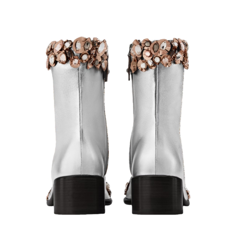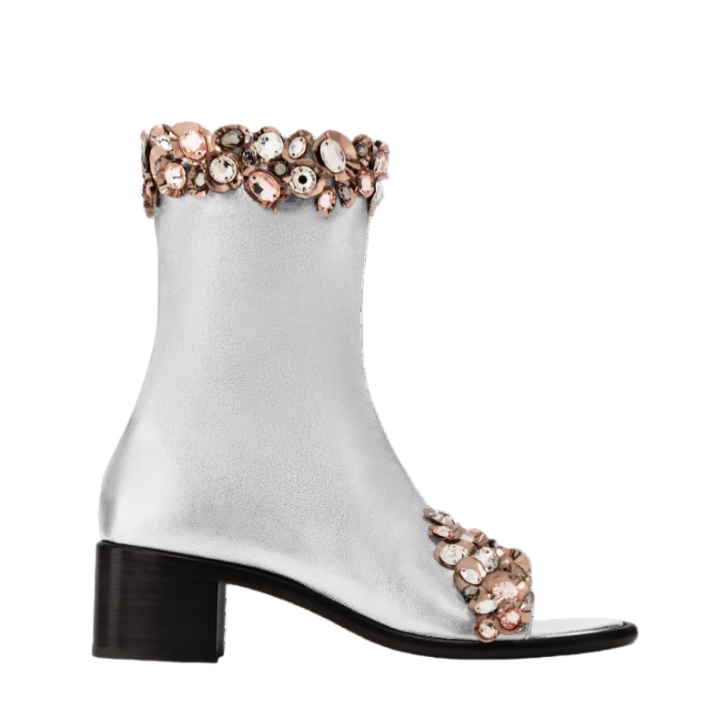 Referencing a statement look of the Cruise 2026 fashion show, the Talisman open-toe ankle boot is crafted from metallic lambskin embellished with glittering stones inspired by Byzantine and medieval adornments. This striking model comes on a low block heel and features a side zip for easy fitting.