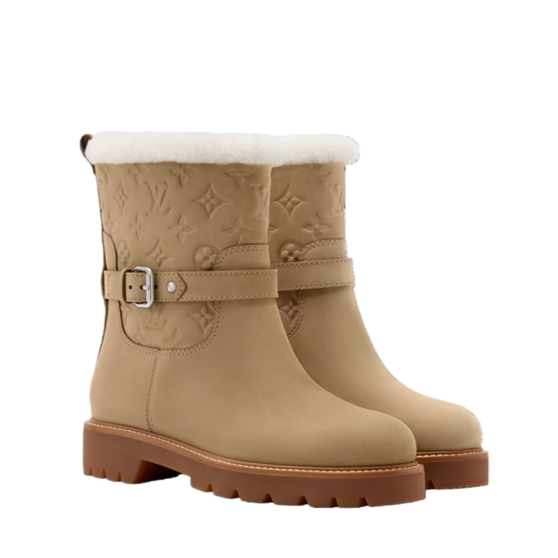 The Territory flat ankle boot is crafted from nubuck calf leather, which is partially debossed with the Monogram pattern. This model has a snug shearling lining, which is visible as trim around the top of the boot, and a decorative, belt-like strap with a silver-toned buckle and studs. It is finished with a sturdy rubber outsole.