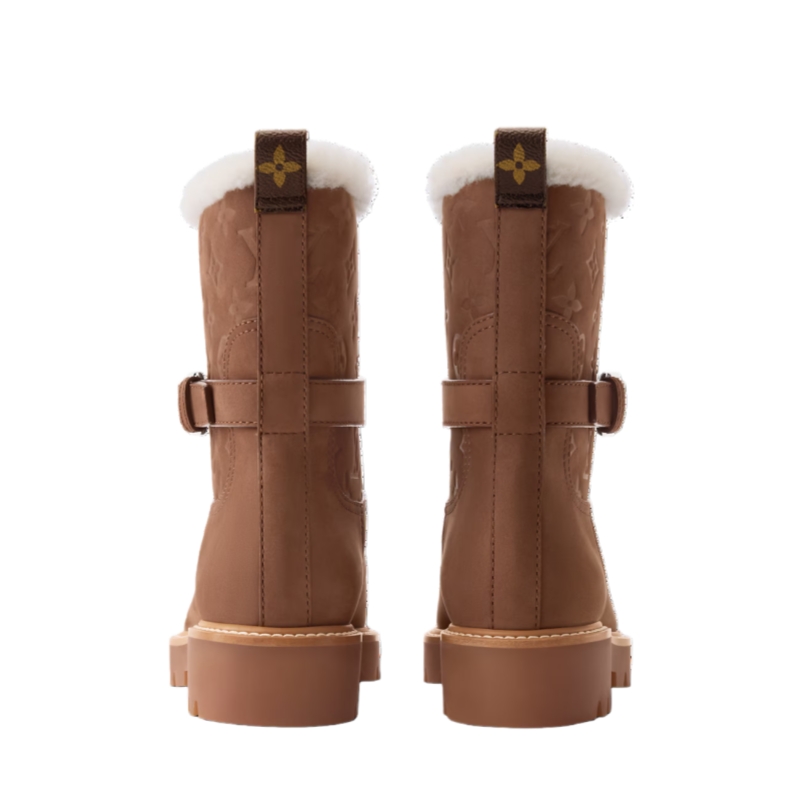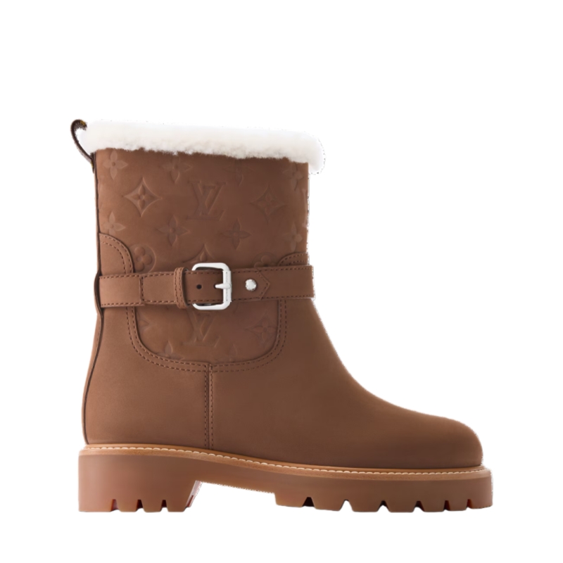 The Territory flat ankle boot is crafted from nubuck calf leather, which is partially debossed with the Monogram pattern. This model has a snug shearling lining, which is visible as trim around the top of the boot, and a decorative, belt-like strap with a silver-toned buckle and studs. It is finished with a sturdy rubber outsole.