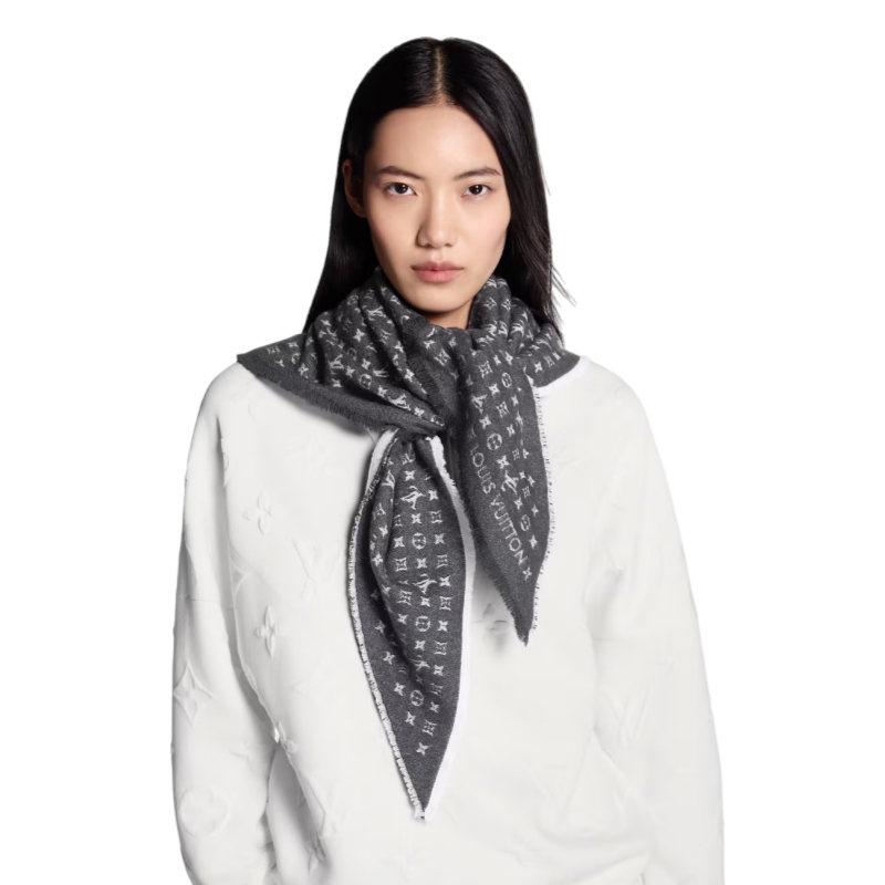 With its ultra-fashionable shape and classic signature design, this casual-chic triangle shawl lives up to its name: The Favorite. A refined mini-Monogram pattern is jacquard woven in opulent wool for an understated House touch. Easy to knot around the neck for an on-trend effect, this versatile shawl complements a variety of looks for all occasions.