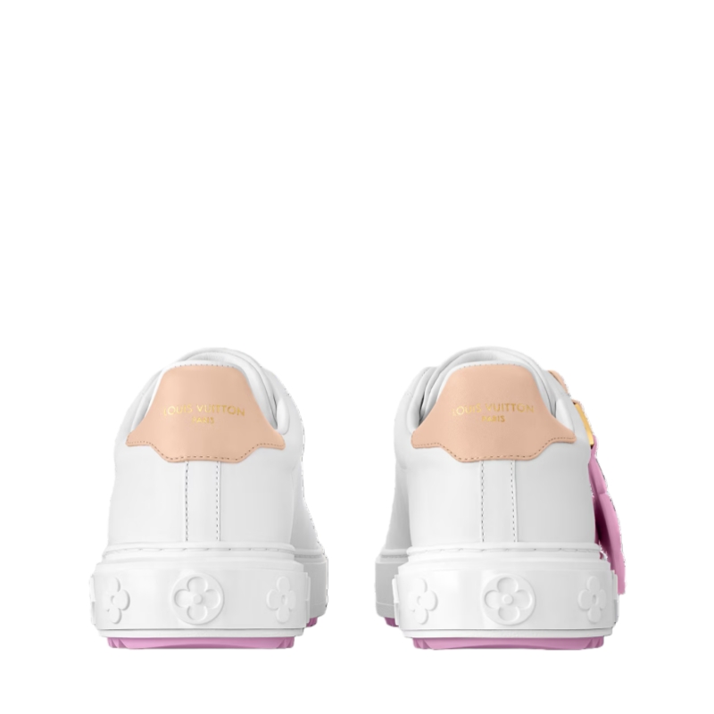 This refined interpretation of the Time Out sneaker comes in soft calf leather, which is discreetly embossed with the LV Initials and Monogram Flowers on the side. A pastel-colored charm featuring the Louis Vuitton Vivienne mascot hangs from an engraved, gold-toned ring. The back of the sneaker is trimmed with the House's emblematic natural leather.