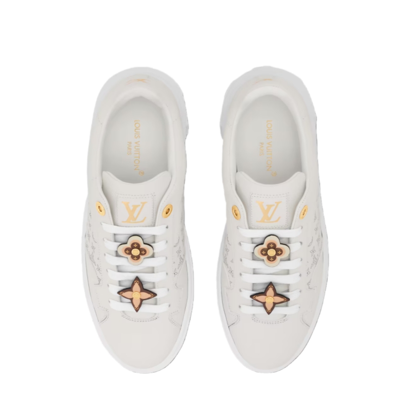 This richly detailed edition of the Time Out sneaker comes in calf leather with trim in perforated Mahina Mongram leather. The laces are embellished with beads in the shape of Monogram Flowers, while the tongue and back are signed with the LV Initials. This model comes on a lightweight EVA outsole decorated with Monogram Flowers.