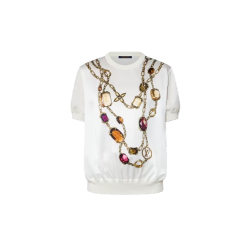 This top is playfully uplifted with the collection’s signature necklace motif printed in rich seasonal tones around the neckline for a statement trompe l’oeil effect. It is spun in a classic T-shirt shape from a fine wool knit finished with neat ribbed hems for elevated everyday styling.