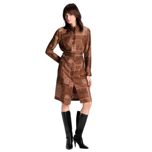 This elegant shirt dress makes an understated statement in an allover print of archival Louis Vuitton travel trunks in the House’s classic colorway. It is cut from fluid silk twill in a straight, long-sleeved silhouette complete with a smart collar and covered button tab for a clean finish. A slim coordinating belt accentuates the waistline.